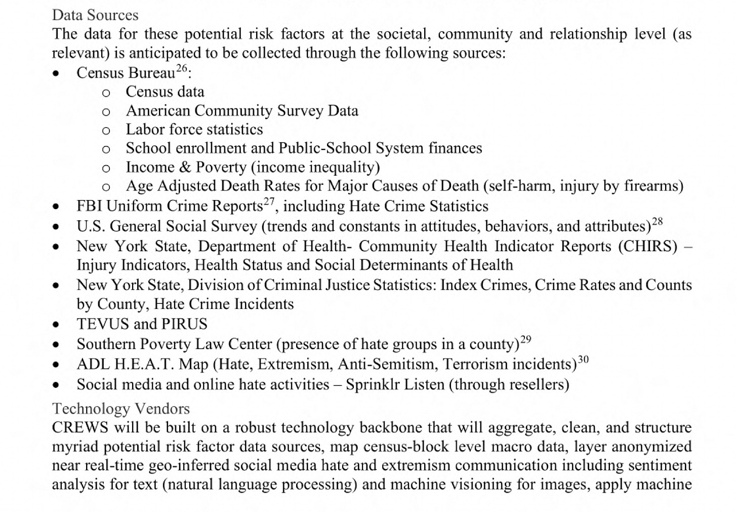 The CREWS contract claims to “prevent targeted violence and domestic terrorism, by utilizing data sciences and statistical analyses to map emerging vulnerabilities in selected geographies.” However, the sources of data that power this tool reveal the project’s dangers.