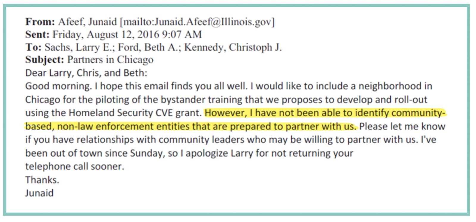 Regarding a previous iteration of a nearly identical CVE program to Tackle!, Junaid Afeef, who worked for a federally funded state CVE program, wrote in an email (cited by American Friends Service Committee and STOPCVE in Chicago) that he was unable to find “non-law enforcement entities” willing to partner with him. Meaning, no Muslim organizational leaders were willing to sit through the bystander training program.